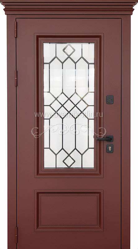 Металлофиленчатая термодверь с карнизом, стеклом, лазерной резкой и порошковым покрытием RAL 3011 КД-1358